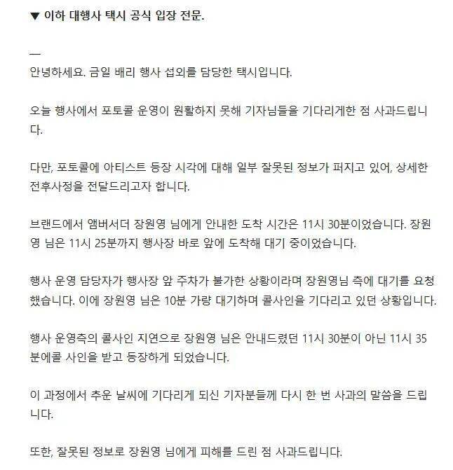 TAXI公司在声明中,一方面就活动运营不畅导致记者久候而致歉,另一方面则明确表示,针对张元英的“迟到”信息属于误传,并对因此给艺人造成的损害表示歉意。这份声明,相当于将张元英从这场本不该由她负责的混乱中彻底剥离出来。